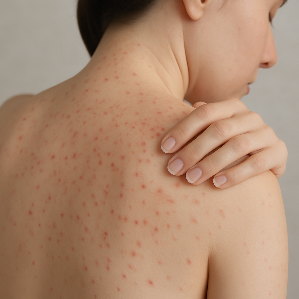 - 작은 두드러기나 발진: 피부에 작은 두드러기나 발진이 나타나며, 주로 팔, 목, 가슴 부위에 발생합니다.